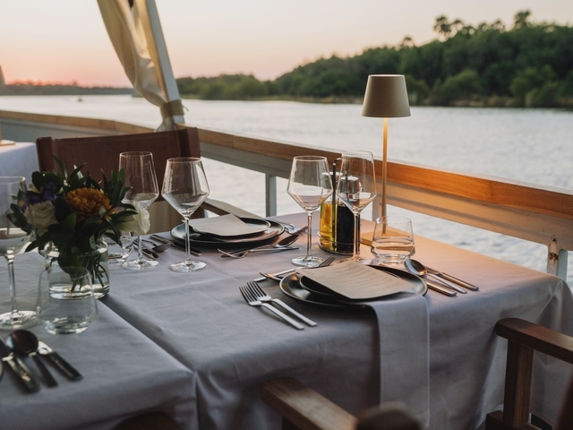 Wenn Sie sich auf diese kulinarische Reise entlang des malerischen Sambesi-Flusses begeben, werden Sie mit einem erfrischenden Willkommensgetränk und einem kalten Gesichtstuch begrüßt, was den Ton für einen Abend voller Raffinesse und Entspannung setzt. Die Tische sind mit frischer Leinen-Tischwäsche gedeckt und in warmes Licht getaucht, das eine gemütliche und intime Atmosphäre schafft, in der Sie Ihr 6-Gänge-Abendessen genießen können. Genießen Sie die ersten köstlichen Gänge, während Sie auf dem Fluss entlangschippern, die atemberaubende Aussicht genießen und sorgfältig ausgewählte Weine schlürfen, die perfekt die Aromen der Speisen ergänzen. Die Kreuzfahrt dauert zwei Stunden, und wenn die Nacht hereinbricht und der Fluss in Dunkelheit versinkt, werden Sie zurück zum Wasser begleitet, wo Sie von beleuchtetem warmem Licht empfangen werden, das eine romantische Stimmung schafft, während Sie den Rest Ihres Abendessens genießen. Tauchen Sie ein in eine bezaubernde Atmosphäre bei dieser klassischen Dinner-Kreuzfahrt.