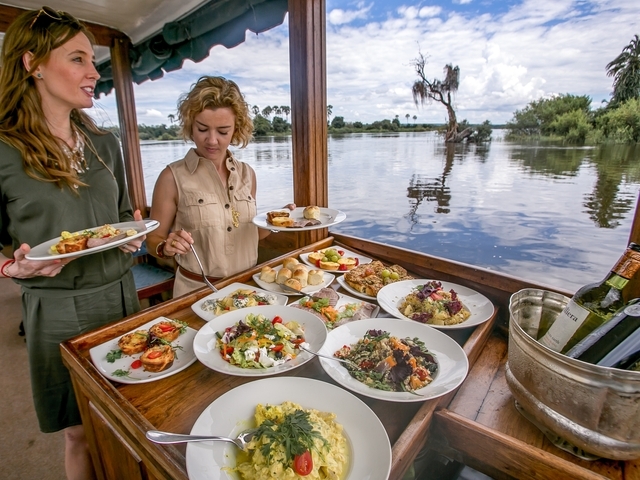 Lehnen Sie sich zurück und entspannen Sie bei einem kühlen Getränk und genießen Sie einige ruhige Stunden entlang der Ufer des Sambesi-Flusses. Unser Mittagsbuffet umfasst kalte Fleischsorten, frische Salate und eine große Auswahl an Keksen und Käse, alles zubereitet vom preisgekrönten Palm Restaurant im Ilala Lodge Hotel. Die gut ausgestattete Bar steht während der gesamten Kreuzfahrt zur Verfügung und das aufmerksame Team ist für Sie da.