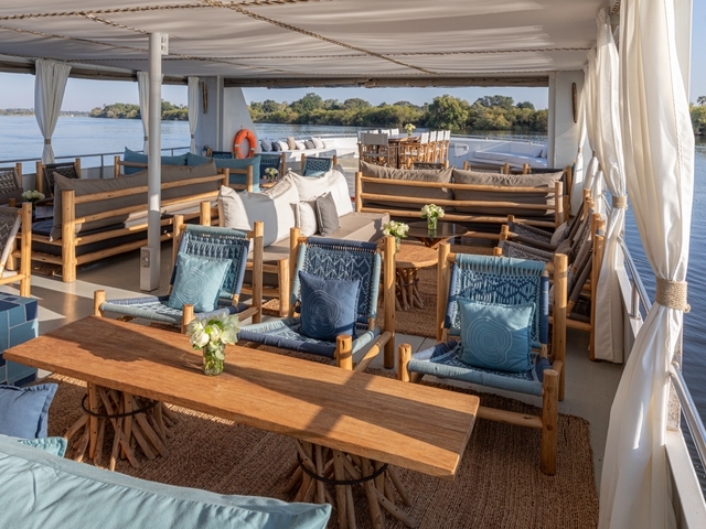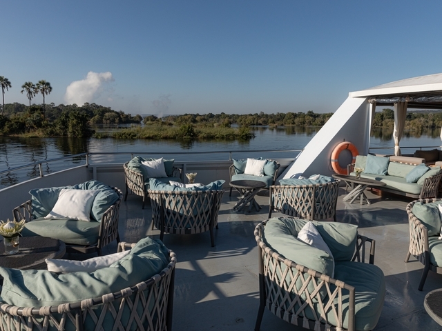 Das ‚Signature Deck‘ ist pure Raffinesse und bietet das ultimative Zambezi-Sonnenuntergangs-Kreuzfahrterlebnis. Gäste sind eingeladen, sich auf den tief eingebetteten Sofas zu entspannen, die die erdigen Töne und Flussblau der Umgebung widerspiegeln. Genießen Sie ungestörte Ausblicke aus 6 m Höhe, köstliche Canapés und den Service eines engagierten Mixologen. Eine Auswahl an Weinen, Bier und handwerklichen Spirituosen steht ebenfalls durchgehend zur Verfügung. Wenn die Sonne untergeht, kehren Sie zum Steg zurück.